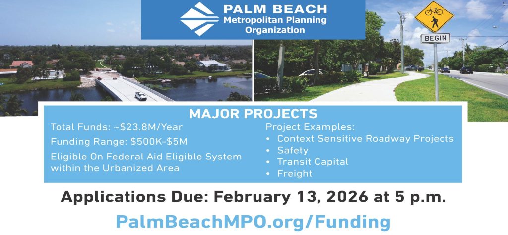 The MPO Major Projects list prioritizes state and federal funds annually for projects in Palm Beach County within the Urbanized Area. The MPO’s LRTP identifies the cost feasible and illustrative projects eligible for funding in the Transportation Improvement Program (TIP).