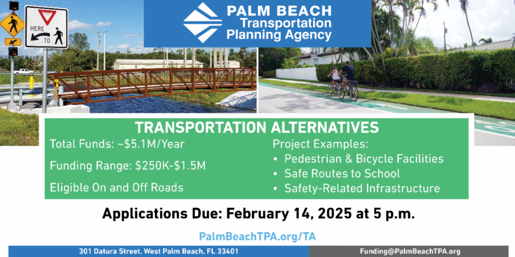 Applications for the Palm Beach MPO’s Transportation Alternatives (TA) Program are open through February 14! This program, in partnership with FDOT, allocates approximately $5.1M annually to support non-motorized infrastructure projects. For more details, review the TA Program Overview and 2024 Workshop Presentation at PalmBeachTPA.org/TA.