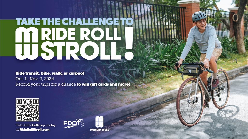 Participate in the Ride Roll Stroll Challenge now through November 2! Ride transit, bike, walk, or carpool for a chance to win gift cards and more. Participating is a great way to gear up for FDOT’s Mobility Week. Get started at RideRollStroll.com.