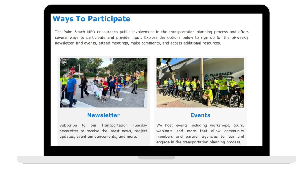 The Palm Beach MPO encourages public involvement in the transportation planning process and offers several ways to participate and provide input. Visit the “Ways to Participate” page on our website to explore resources, stay informed, and find opportunities to get involved with the Palm Beach MPO.