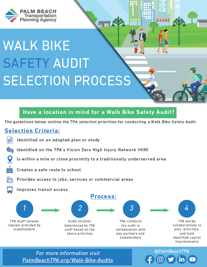 The purpose of conducting a Walk Bike Audit is to identify pedestrian and bicycle issues by being on the ground and experiencing the built environment firsthand. The Palm Beach TPA conducts these audits, in collaboration with the municipality, roadway owners, and other stakeholders, like Palm Tran or the School District of Palm Beach County, in order to improve safety and access for people of all ages and abilities. After these audits are conducted, the TPA works to collaboratively plan, prioritize and fund identified safety improvements.